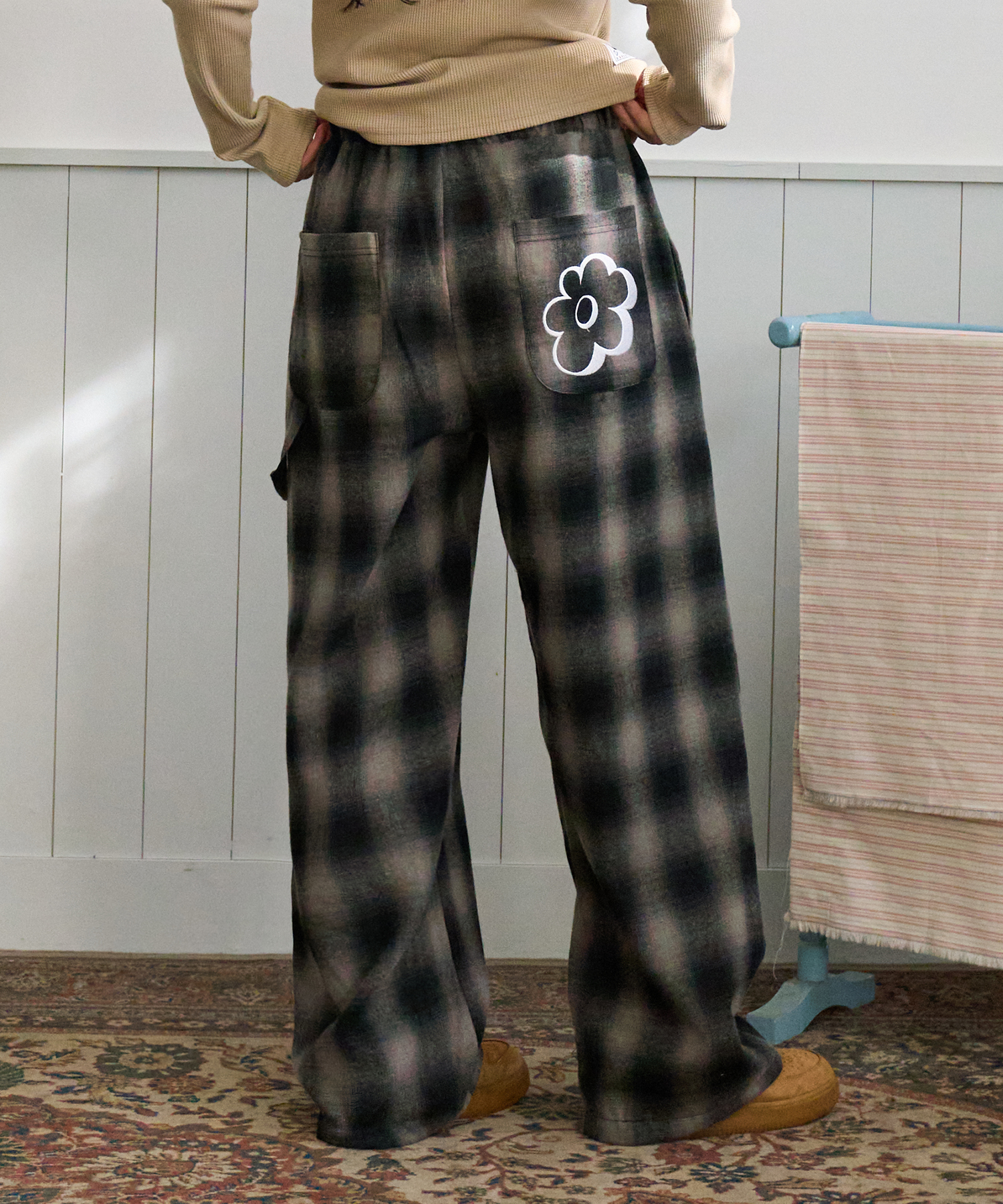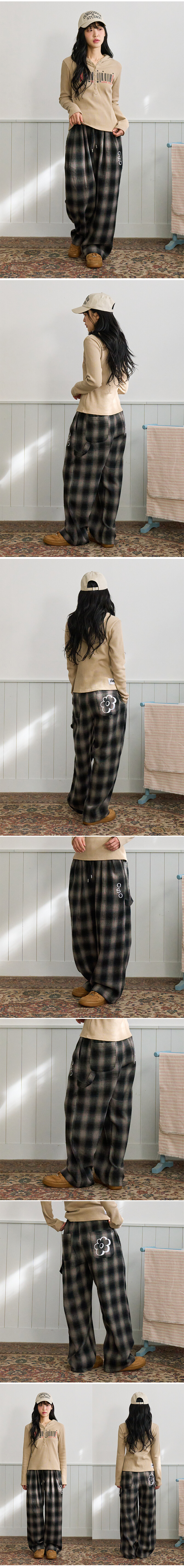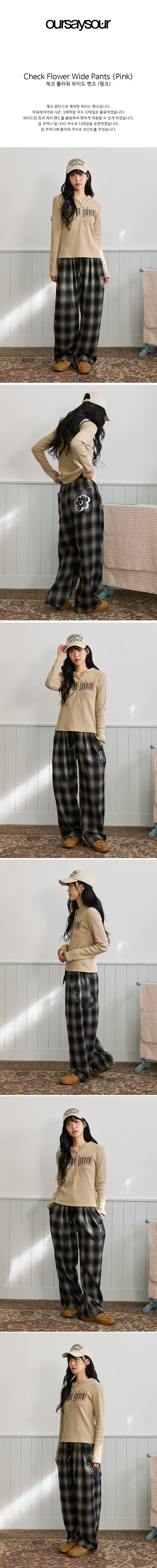 체크 플라워 와이드 팬츠 핑크