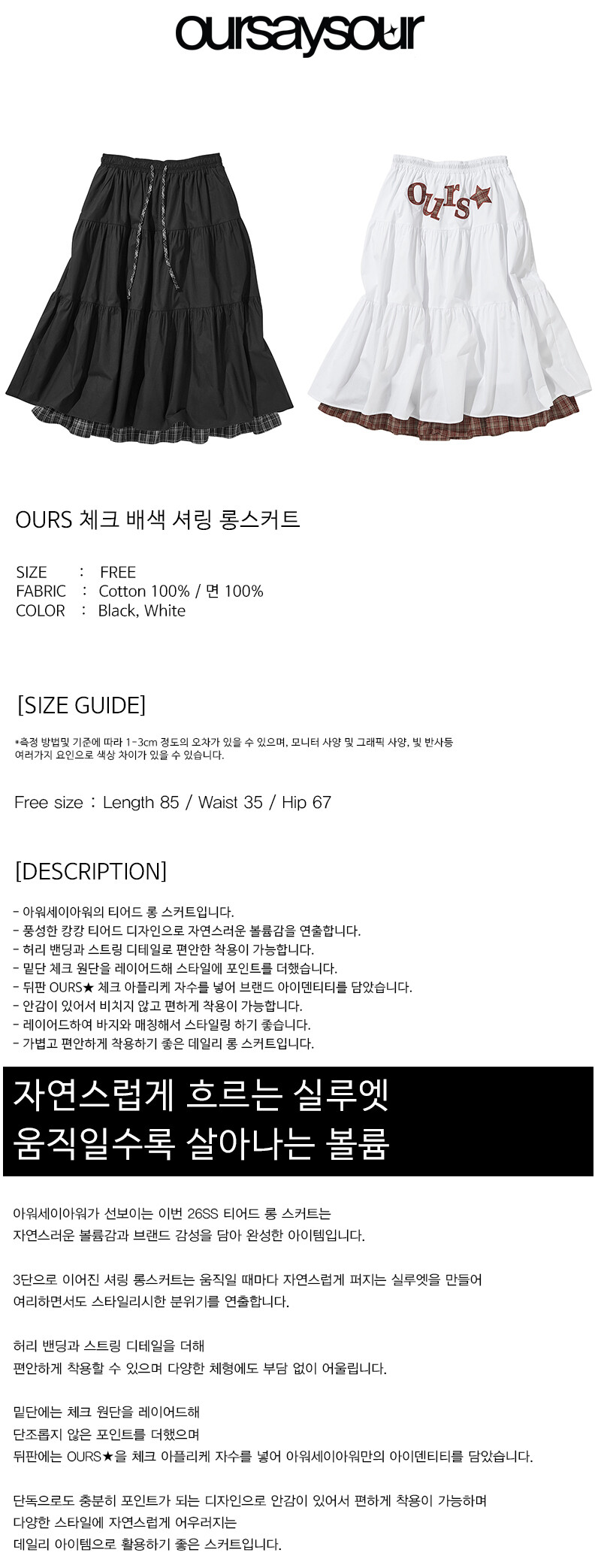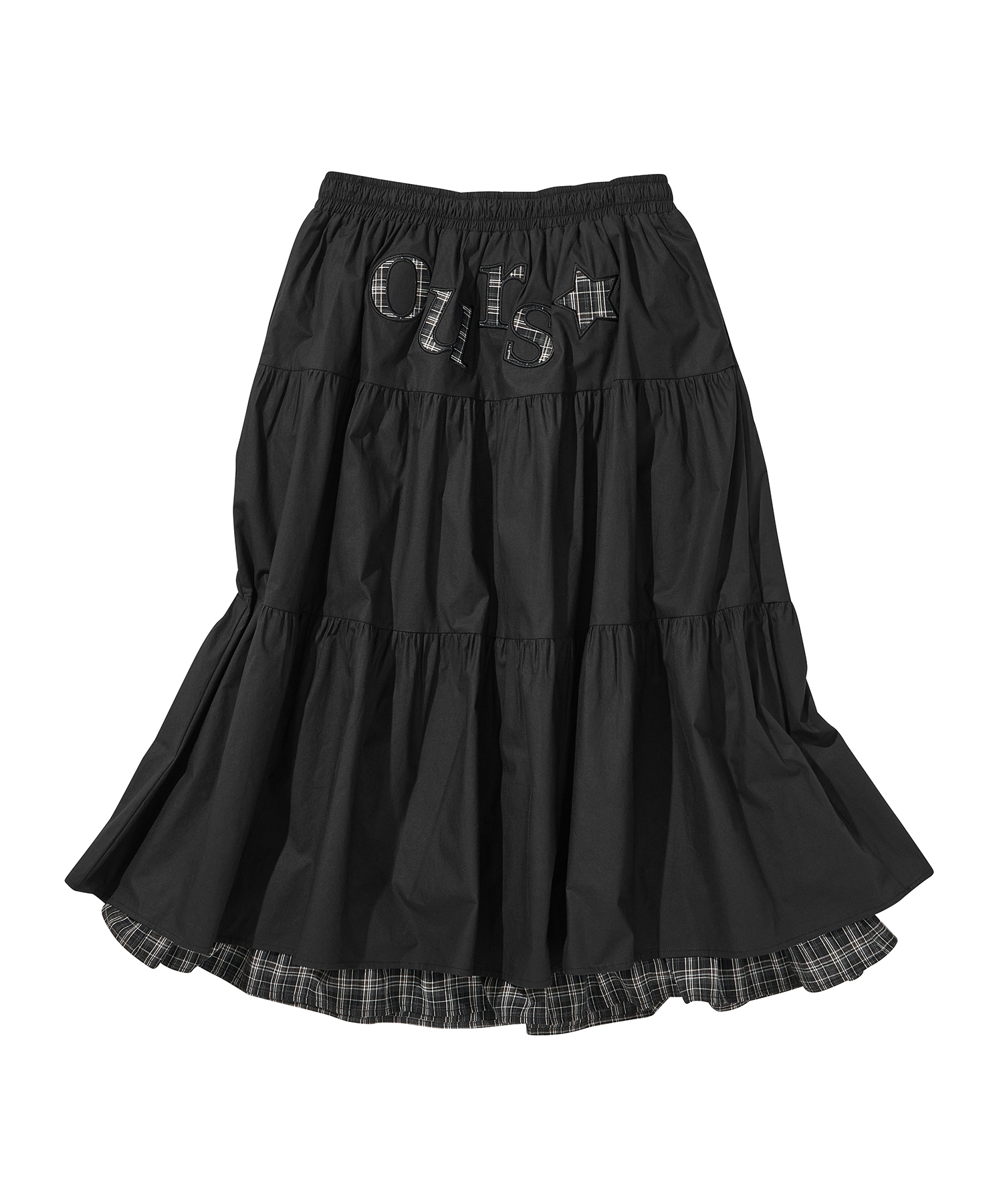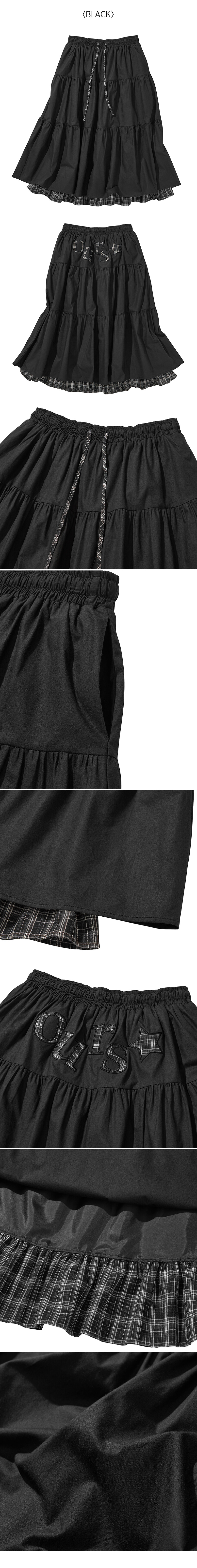 OURS 체크 배색 셔링 롱스커트 블랙
