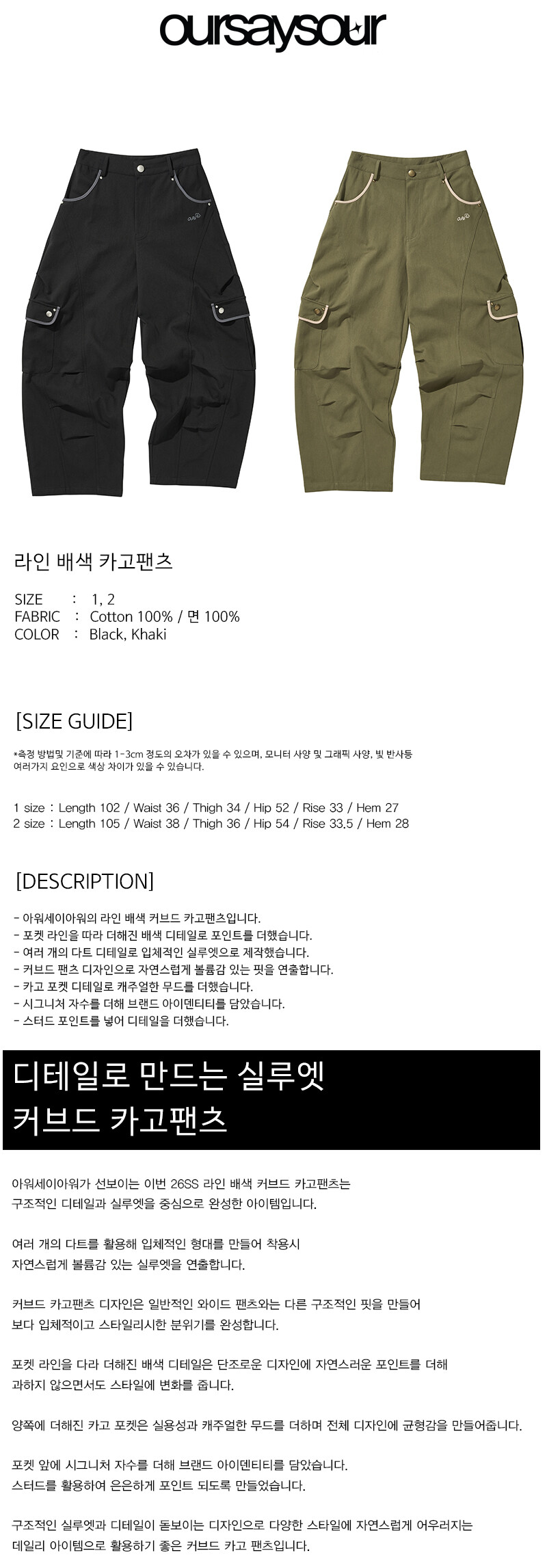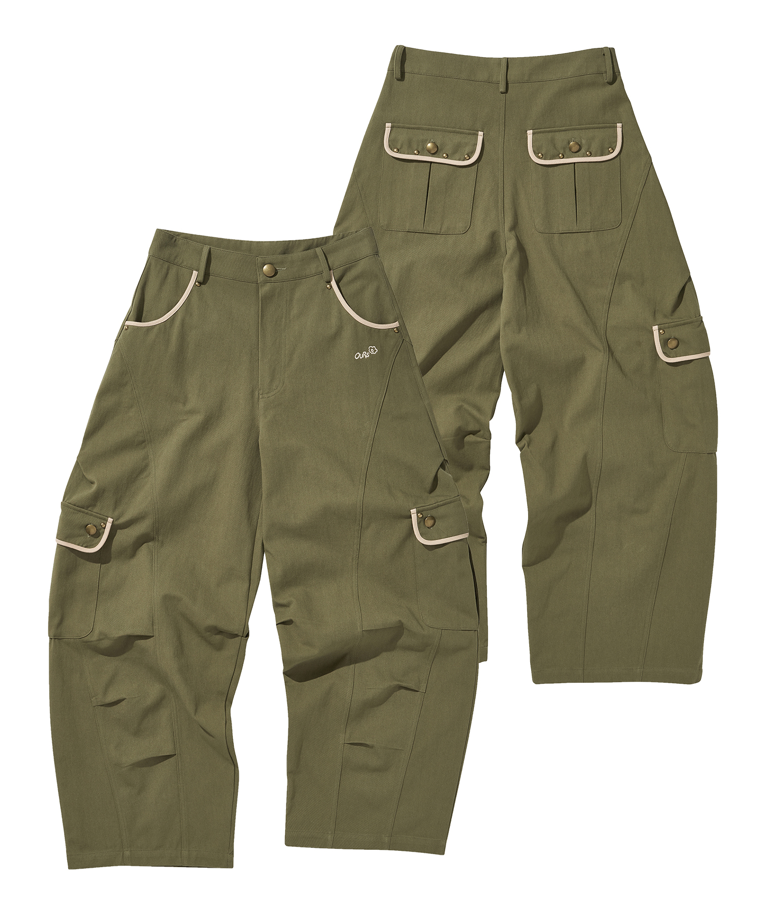 라인 배색 커브드 카고팬츠 카키